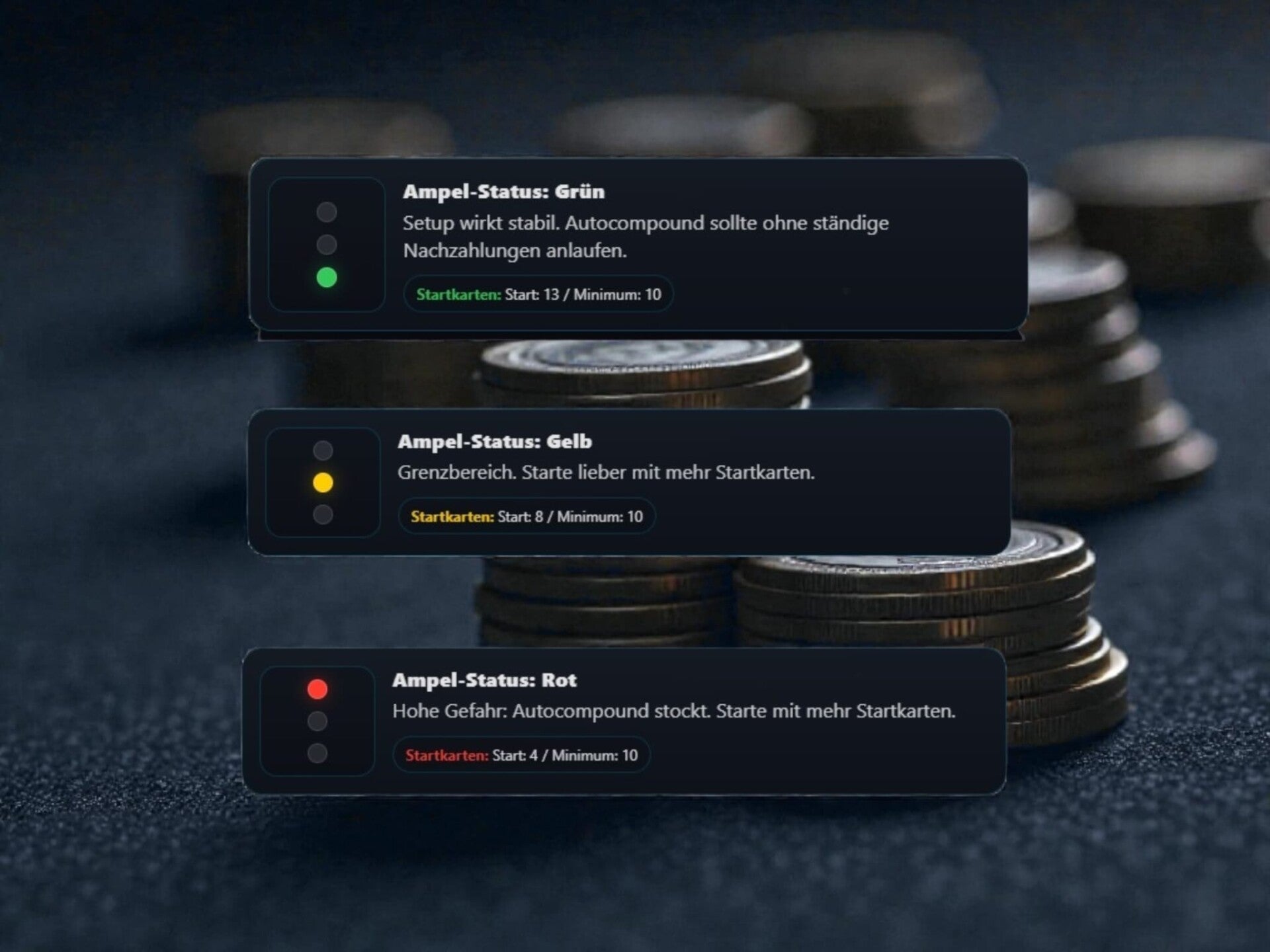 Er dient als schnelle Einordnung der Systemstabilität und macht auf einen Blick sichtbar, ob das Setup tragfähig ist, sich im Grenzbereich befindet oder ein Nachjustieren der Startkarten erforderlich ist.
