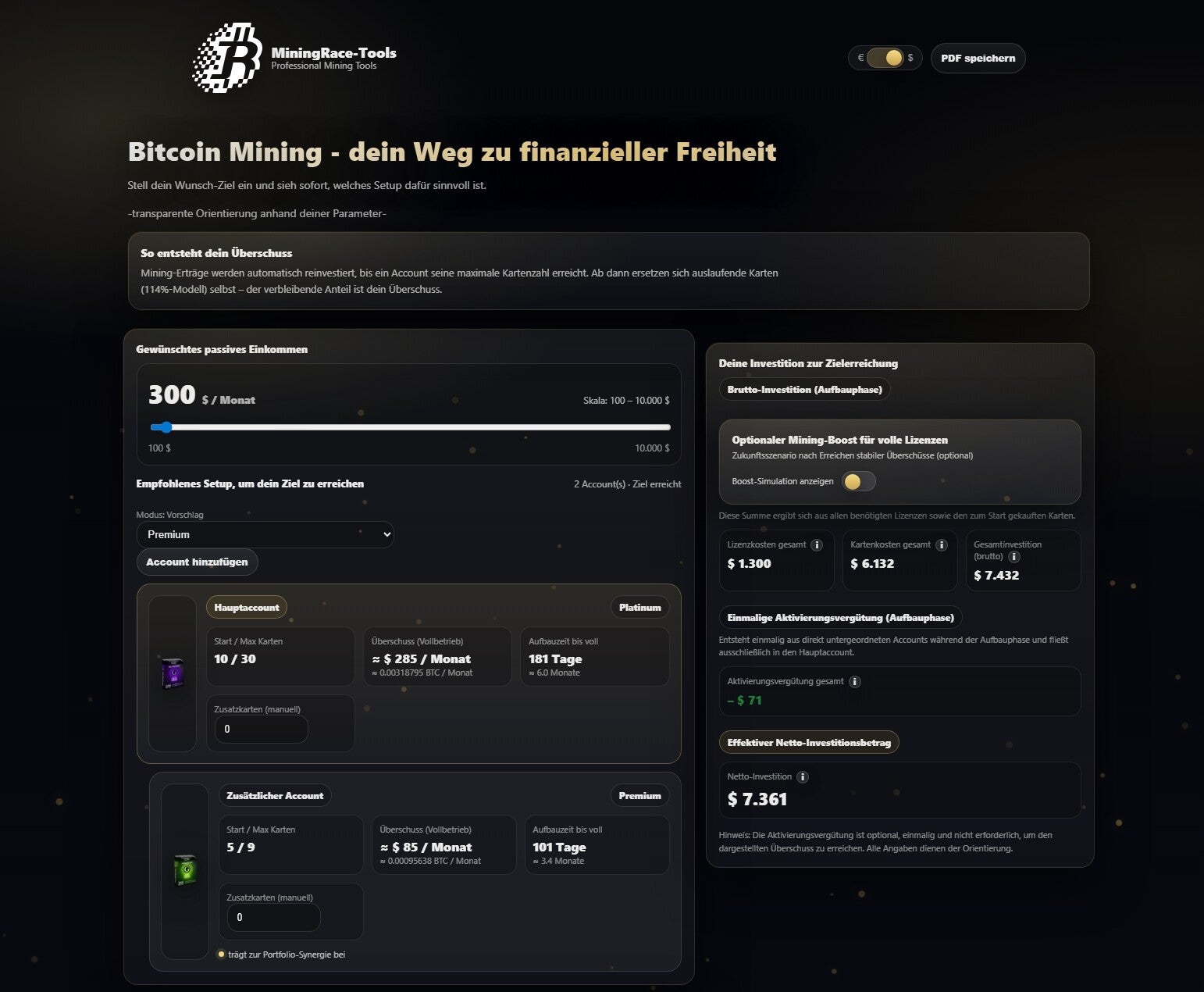 +mit dem Miningboost wird sehr anschaulich dargestellt was aus seinem Invest wird wenn statt mehr Geld lediglich etwas mehr Zeit investiert wird